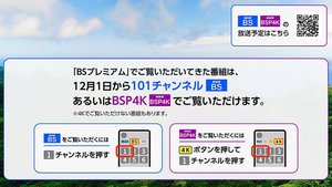 現在BSプレミアムを放送している103chは、12月1日以降、2024年3月31日まで「番組の移設や停波時期を説明・周知するチャンネル」として活用。NHK BSプレミアム4Kの番組を2K映像とステレオ音声にダウンコンバートして放送したり、風景映像などを交えながら、画面に再編の情報を案内して告知する。この案内表示は視聴者が消すことはできず、表示なしで番組を視聴したい場合は101chのNHK BSに移動する必要がある。