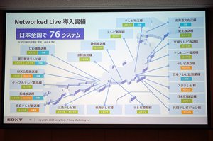 制作環境では「Networked Live」を大きくアピール。高画質・高圧縮・低遅延の伝送や、オンプレミス/クラウドの環境を選ばず、ハイブリッドに運用できる環境構築を実現する最新ソリューションだ。ネットワークに接続されたカメラや機材の統合管理など、場所や規模を問わないライブ制作環境を構築することができる。現在日本全国で76システム、全世界で約200システムが導入されている。