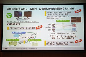 「ネットワークとリソースの統合管理」では、メディアオーケストレーションプラットフォーム「VideoIPath」を活用し、クラウドともフェデレーションを実現する。カメラの切り替えやサーバーグラフィックスの共有など、設備間の機材共有を面倒な設定なしに簡単なUI操作で行える新機能を追加。ブロードキャストコントローラー機能もさらに拡充され、設備内・間のIP統合制御がさらに進化している。
