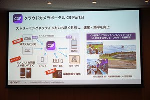 Creators' Cloudで展開するサービスとして、クラウドカメラポータル「C3 Portal」をクローズアップする。主に取材用カメラと連携し、撮影後すぐに素材をクラウド上にアップロードして共有でき、後続作業の速度・効率アップが期待できる。新機能としてストリーミングのSRT入力に対応し、使い勝手を向上する。