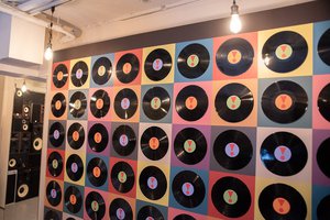 階下のエリアでは壁一面のアナログレコードやJBLスピーカーが積み上がった「スピーカーウォール」など、一転してレトロムードなフォトスポットを展開。会場内に用意されているワイヤレスヘッドホン「TOUR ONE M2」「LIVE770NC」を装着して記念写真を撮ることもできる。