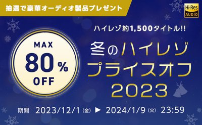 音楽ダウンロードサービスmoraは、1,500タイトル以上のハイレゾ音源を最大80%オフで販売する「mora 冬のハイレゾプライスオフ2023」を、2023年12月1日から2024年1月9日まで開催する。