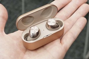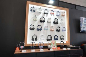 別のブースでは「黒柿」採用の密閉型ダイナミックヘッドホン「ATH-AWKG」が試聴できるようになっており、貴重な材木を用いたハイエンドモデルの音を確認しようと来場者が列をなしていた。また会場1FではBluetooth対応モデルがメインで展示されており、完全ワイヤレスイヤホンのほか、“サウンドバーガー” も並べられていた。