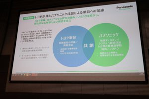 またディスプレイは、車内の左側面から右側面までカバーする “Pillar to Pillar” を採用。この場合、車両側面への他車両の衝突(側突)の際に衝撃を受けやすくなるが、破損して乗員に怪我をさせないような構造も実現している。衝撃への対策にあたり、トヨタ車体とパナソニックで共創を行い、両社の強みとノウハウを投入した。