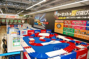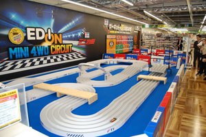 ミニ四駆のサーキットは3レーンと家電量販店初の5レーン樹脂製コースが用意され、商品の品揃えも地域最大級をアピールする。