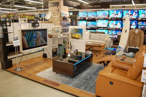 セルフで自由に試聴ができる100モデル以上の商品を用意した「完全ワイヤレスイヤホン」コーナーを大きくアピール。「聴いてみたい」のハードルをグンと引き下げる。テレビコーナーではニトリとのコラボにより、リビングでの使用シーンを提案している。
