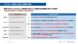 JEITAの取り組みとしては、2018年5月に公開した「AIに関する提言」について、この12月に改訂版を公開。「AIは人と社会、文化の発展のためにあり、積極的に利活用すべき」と明記した上で、「AIの有用性、特徴とリスク、倫理的原則への正しい理解を産官学連携で広め、AIを適切に利活用することが重要」と提言する。