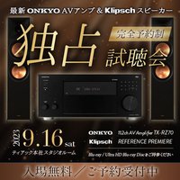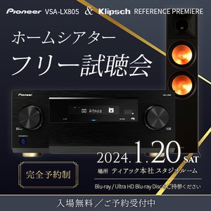Dirac Liveを搭載したパイオニアの11.4ch AVアンプ「VSA-LX805」と、アメリカのスピーカーブランドKlipschの最新スピーカー「REFERENCE PREMIERE」シリーズの組み合わせで、自身お気に入りのBlu-ray/Ultra HD Blu-ray Discが楽しめるフリー試聴イベント。「最新のAVアンプを用いた映画館のような音の迫力を是非ご体験ください」と呼び掛けている。