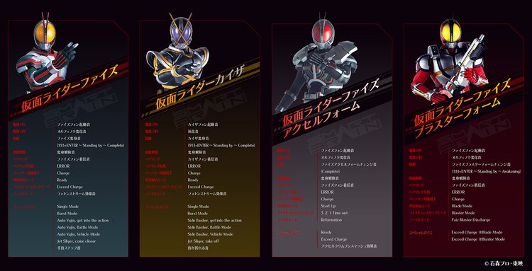 電源ON/OFFなどを通知するボイスガイダンスには、株式会社バンダイの全面協力によりファイズギア&カイザギアの音声を多数使用。仮面ライダーファイズ/仮面ライダーカイザ/仮面ライダーファイズアクセルフォーム/仮面ライダーファイズブラスターフォームの4モードを収録。モード切替は専用アプリ「AVIOT SOUND ME」で行う。