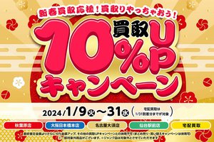 期間中の同店での買い取り利用者を対象に、買い取り金額を最終査定額からさらに10%アップするというもの。実店舗(秋葉原店、大阪日本橋本店、名古屋大須店、仙台駅前店)への持ち込みと、宅配買取のどちらでも対象になる。