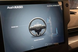 またアルコール検知については、ハンドルの上に設置されたセンサーに息を吹きかけると、CO2とアルコールの検知量がカーナビ部分にグラフとして表示される仕組み。そして子どもの検知については、ミリ波の技術をもつカナダのPontosense社の技術を活用し、競合よりもノイズの少ない検出を実現しているという。