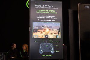 さらにもうひとつ、“世界初”のハプティクス搭載ゲーミングクッション「Project Esther」も参考出展。16個のハプティックアクチュエーターを、体に最大限接触するよう配置。旧来のハプティックデバイスは単一的な方向・タイミングの触覚情報しか得られなかったが、RazerのSensa HD Haptics技術によって、コンテンツのプレイ状況に応じた触覚情報を提供するという。