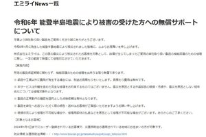 エミライは、1月1日に発生した能登半島地震で故障が生じた同社取り扱い製品について、登録ユーザーに対して無償で修理対応を行うと発表した。