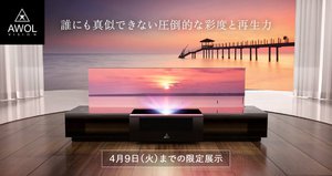 IDC OTSUKA 有明ショールームにて4月9日までの期間限定で展示販売がが行われているのは、4K超短焦点プロジェクター LTV-3500と専用スクリーン一体型のTVボード「Vanish TV(120インチ)」。「リアルな臨場感と没入感を堪能できる『AWOL VISION』で、より豊かなライフスタイルを提案いたします。ぜひこの機会に至極の映像体験をお楽しみください」とアピールする。
