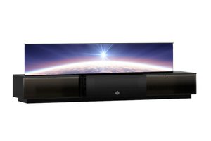 Vanish TVは電動式キャビネットとスクリーンが一体化したTVボード(サイズ:2950W×2148H×589Do)。ロールスクリーンがボタンひとつで出現し、中央にプロジェクターを収納する開閉機構を備える。両サイドにはTVチューナー、ディスクプレーヤー、ゲーム機器等の収納スペースも設け、インテリア性を損ねることなくホームシアターを導入できる。価格は1,430,000円(税込)。