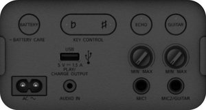 入力端子はステレオミニ1基/マイク1基/マイク・ギター1基/外部メモリからの音楽再生や、スマートフォンなどへの給電に対応するUSB Type-Aポート1基を搭載する。BluetoothコーデックはLDAC/AAC/SBCをサポートする。外形寸法は約269W×564H×294Dmm、質量は約11.2kg。