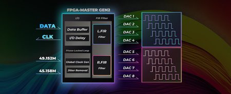 また、FPGA-Master2.0が備える新しいアルゴリズムにより「FIR 2x/FIR 4xモード」を実現。各DACチップのデータストリームを1クロックずつ精密にずらす「ディレイ・パラレル出力」を行い、最大4基のDACチップでハードウェア・アナログFIRフィルターを形成する。本機能を利用することで複数のDAC間の差を平均化し、歪みやサウンドディテール、リアリズムを大幅に改善できるという。