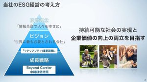 説明会の中で宮川潤一社長は、同社のESG経営に対する考え方として「情報革命で人々を幸せにするという経営理念と世界に最も必要とされる会社とのビジョンを持ち、そこからマテリアリティを特定し、事業を通じて対応していくことで、持続可能な社会の実現と企業価値の向上の両立を目指していく」と訴えた。
