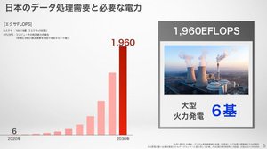 日本のデータ処理に必要な計算能力は、2030年には1,960エクサFLOPSという単位になると予測され、今の300倍強もの膨大なデータ処理となり、そのために必要とされる電力量は大型火力発電所6基分に相当するという。