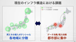 日本の再生可能エネルギーの導入ポテンシャルは、北海道を筆頭に東北、九州など地方に分散している。一方でデータ処理は、海底ケーブルを陸揚げする場所などといった物理的な問題から東京と大阪に集中している。「再エネを地方で発電し、都市部に送ればよいと思われる方も多いが、実は送電網の容量がボトルネックとなり大量の送電は困難」と、次世代を支えるに際して、現在のインフラは大きな課題を抱えていると指摘した。