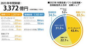 また音楽配信売上実績と合わせ、2023年音楽ソフト生産実績も公表。オーディオレコード(CDシングル/CDアルバム/アナログディスク/カセット・その他)、音楽ビデオ(音楽DVD/音楽Blu-ray)を合わせた生産金額は2207億円で、昨年を上回った。