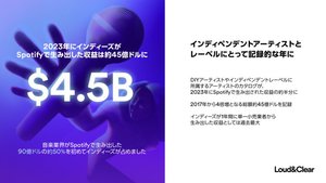 45億ドルという数字は、Spotifyにおけるインディーズ収益としては2017年の4倍の額となるうえ、IFPIの Global Music Report 2023によれば、米国を除いた全世界の国における録音音楽全体の収益を上回る結果だとする。
