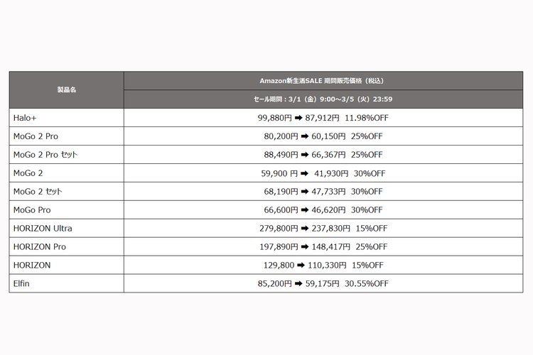 バッテリー内蔵のポータブルプロジェクターは、「Halo+」が11.98%オフで1万円超の値引きになるほか、「Mogo Pro」も30%オフに。持ち運びやすいコンパクトプロジェクターは、「Mogo 2 Pro」とプロジェクター台がセットになった「Mogo 2 Pro セット」が25%オフ、「Mogo 2」と「Mogo 2 セット」が30%オフとなる。