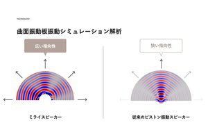 従来のピストン振動を採用したスピーカーと、曲面サウンドを採用した本モデルの音波を比較すると、従来よりも高音域の音を広範囲に届けられていることが、シミュレーション解析の結果から確認できたとのこと。加齢などから生じるテレビの音の聴こえにくさを改善してくれる特徴を備えている。