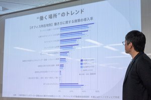 金子氏によれば、新型コロナ感染症流行当初は“物珍しい”存在だったテレワークもいまやすっかり定着し、首都圏では各企業がオフィス出社を再開しつつある一方、オンライン会議やチャットツールの利用率は依然として高いまま。シェアオフィス、コワーキングスペースの市場規模も拡大し、関連事業者の多様化が進んでいるという。