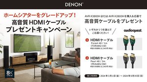 デノンは、AVアンプ「AVR-X3800H」「AVR-X2800H」を購入した方にAudioQuest製HDMIケーブルをプレゼントするキャンペーンを本日3月1日より実施する。