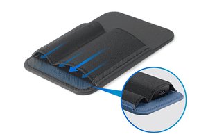 本体には2つのポケットを備え、ひとつはUSB-DAC、もうひとつはケーブルを収納する役割になっている。素材には伸縮性のある高弾性バンドや、ツートンエンボス加工を施したSYNT3社の高級PUレザー「SILHOUETTE(シルエット)」生地を採用。ほか、ポケット下部には緻密に設計された段差を設け、機器の滑り止め/落下防止を実現するなど、デザインと使い勝手の良さの両立を図っている。