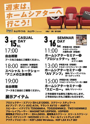 1日目である15日(金)は17時オープンのカジュアルデーです。ホームシアターにちょっと興味があるけれど、ショップに行って店員さんとお話しするのはハードルが高い、そんな方にはこの日がおすすめ。入退場は自由で、各ブースを自由にご覧いただけます。