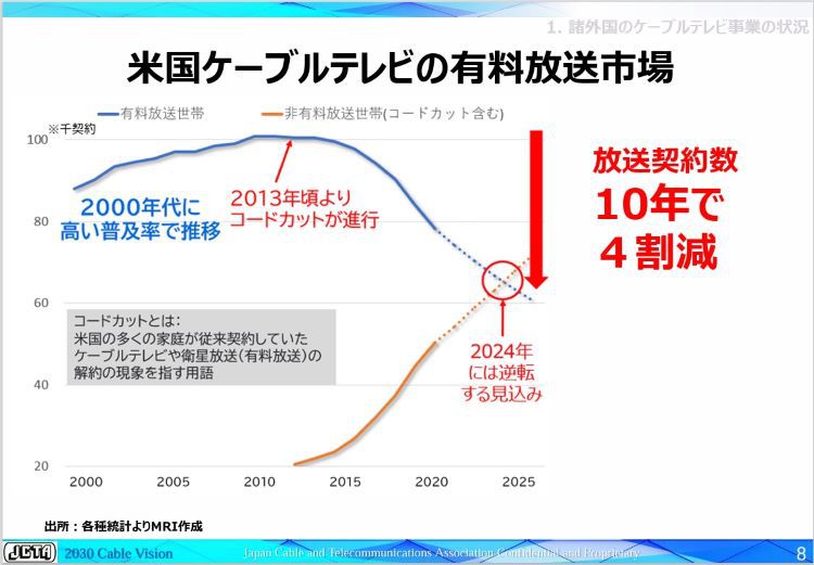 ケーブルテレビの顧客基盤は大きく縮小する恐れに直面しており、契約数は何も策を講じなければ、2020年には2,682万世帯であったものが、2030年には1,459万世帯まで大きく縮小することが余儀なくされると予測する。