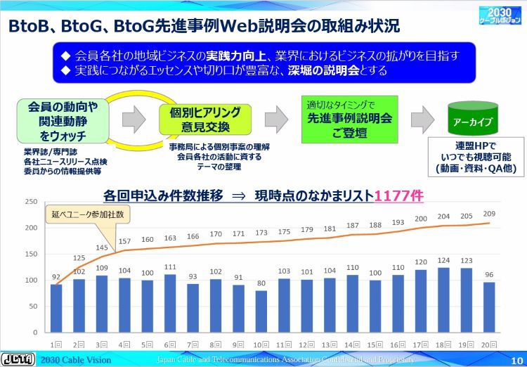 「2030ケーブルビジョン」発表後、ケーブルテレビ業界では地域DXの実践が各地で重ねられているが、事業者間での取り組み格差が広がってきたことも事実。そのようななかで2021年10月にスタートした「BtoB/G/C先進事例Web説明会」は、会員各社の地域ビジネスにおける実践力向上と業界におけるビジネスの拡がりを目的に、実践につながるエッセンスや切り口の事例を“深掘り”して解説するもの。2024年2月の開催で20回を数えた。