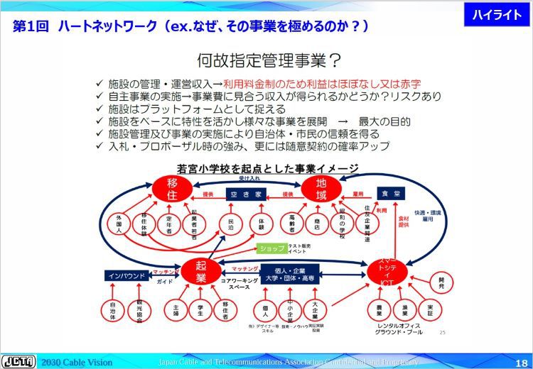 総務省「活力ある地域社会の実現に向けた情報通信基盤と利活用の在り方に関する懇談会」の資料を引用し、「地域DXを実現するためには、変革を主導する“X人材”と、ソリューションの開発を主導する“D人材”の参画が必要であり、それぞれに求められる能力は異なる。地域課題の洗い出しなどを行うX人材は地域事情に精通したものが望ましく、ここがケーブルテレビ事業者の役割そのものと再確認した」。