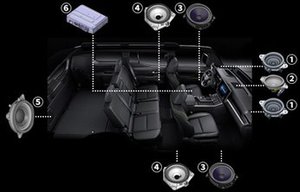 スピーカー構成は、インパネサイドに9cm CST(Coherent Source Transducer)を2基、インパネセンターに9cm ミッドレンジを1基、フロントドアに18cmウーファー、リアドアに16cmフルレンジを2基ずつ、バックドアに20cmサブウーファー1基を備える。