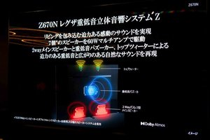 Z670Nシリーズには、高音質技術「レグザ重低音立体音響システム Z」を搭載。トップトゥイーター/2ウェイ・バスレフ型メインスピーカー/重低音バズーカ、計7個のスピーカーを搭載し、60Wマルチアンプで駆動させている。75型のみ、メインスピーカーにダブルフルレンジスピーカーを採用した計9個のスピーカー構成となっている。3DオーディオフォーマットのDolby Audioにも対応する。