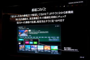 放送番組の高画質技術「地デジAIビューティ」では、地デジやBSの放送番組のノイズ抑制をはじめ、精細感復元技術などによって画質向上を実現。クラウド上にデータベース化した地デジやBS番組のジャンル、番組タイトルごとの映像調整パラメーターを、視聴中の放送番組の映像に反映することで、最適な高画質処理を可能とする「クラウドAI高画質テクノロジー」も装備する。