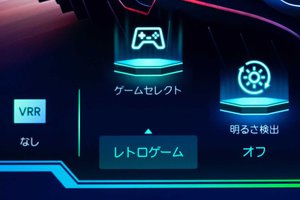 「ゲームセレクト」では、スタンダード/シューティング/ロールプレイング/レトロゲームといった、ゲームタイトルのジャンルに最適化した映像モードの選択が可能。FPSなど反応速度を重視するならシューティング、ムービーシーンが多く高画質化も図りたい作品はロールプレイング、そして旧作のゲームタイトルなどをできるだけ超解像処理などを行わず、そのままの映像で楽しみたい場合はレトロゲームの選択を想定しているという。