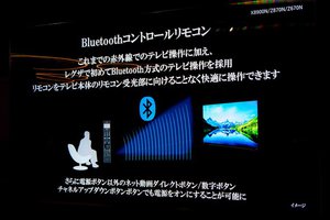 付属リモコンは、従来の赤外線接続に加えBluetooth接続対応し、操作感を向上。また電源ボタン以外の、ネット動画ダイレクト/数字/チャンネルアップダウンボタンでの電源オンも可能としている。