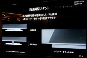 設置性を高める機構として、高さ調整ができるスタンドが新たに採用されており、通常設置と高位置設置の2段階に対応。高位置設置は、テレビ下にサウンドバーを設置したい場合などに最適だという。併せて回転スタンドも採用しており、左右水平15度の角度調整が可能だ。高さ調整と回転スタンドは、43/50/55/65型が対応する。ネットワーク機能ではAirPlay 2やミラーリング機能も搭載する。