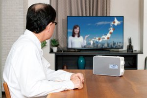 本製品は、テレビの音声をワイヤレスで再生できるポータブルスピーカー。同梱されるワイヤレス送信機をテレビに接続することで、音声が聴こえにくいときや、画面から離れた場所にいるときでも、手元に置いたスピーカーからテレビの音声を聴くことができる。