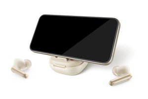 充電ケースの形状は、スマートフォンを立てかけてハンズフリーで動画視聴や通話が行えるSoundcore初のケースデザインを採用。充電ケースのつまみを引き出すことで、スマホを立てかけてスタンドとして使用できる。