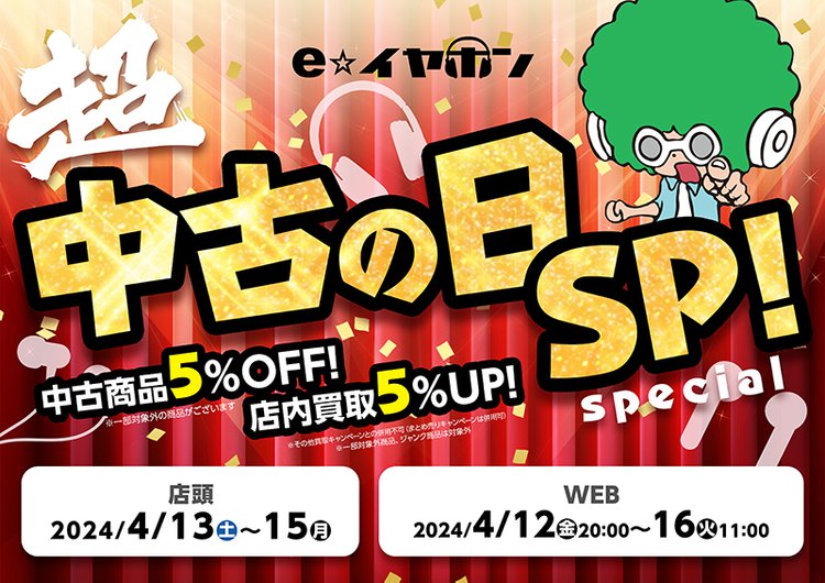 e☆イヤホン、中古品5%オフ/買取5%アップの「超中古の日SP」開催。大阪日本橋本店の限定施策も