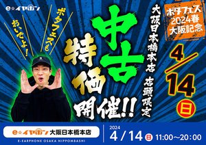イヤホン・ヘッドホン専門店のe☆イヤホンは、4月14日に実施するポータブルオーディオの展示試聴イベント「ポタフェス 2024春 大阪・なんば」開催記念として、全店施策「超中古の日 SP(スペシャル)」、および大阪日本橋本店の限定施策「中古・買取施策」をそれぞれ実施する。