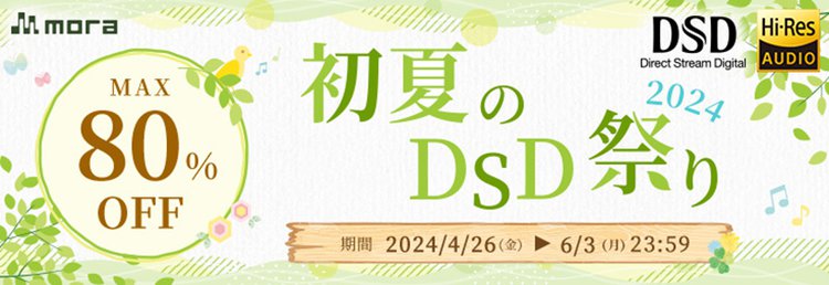 ソニー・ミュージックソリューションズが運営する音楽ダウンロードサービス「mora」にて、DSD音源が最大80%オフのセール価格になる「初夏のDSD祭り2024」が、本日4月26日より開催される。期間は6月3日(月)23時59分まで。
