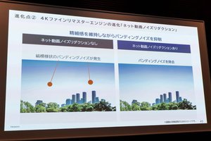 「ネット動画ノイズリダクション」は、圧縮の大きいネット動画で多発するバンディングノイズを抑制する。バンディングノイズとはグラデーションの部分で縞模様のようなノイズができるものだが、本機能によってディティールをしっかり出したい部分は精細感を保ちながら、滑らかな階調表現を可能としている。