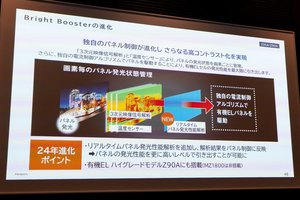 独自のパネル制御技術「Bright Booster」も進化。本技術は、パネルの発光状態を「3次元映像信号解析」と「温度センサー」を用いて画素毎に管理。新高画質エンジンによって追加された「リアルタイムパネル発光性能解析」での解析結果も独自の電流制御アルゴリズムに反映させてパネルを駆動させることで、有機ELの発光性能を最大限に引き出し、従来機以上の高コントラストを実現する。