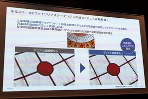 高画質エンジン「新世代 AI高画質エンジン」を搭載。新たなAI超解像の高精細アップコンバート映像と、数理モデル3次元超解像の自然なアンプコンバート映像を、元素材の情報量に応じて最適に剛性する新世代の超解像技術「デュアル超解像」では、従来の超解像技術を上回る解像感とリアルさを実現しているという。