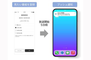 「番組開始通知」では、お気に入りの番組の放送開始時間が近付いた際に、スマートフォンにプッシュ通知によって知らせてくれる機能を追加。視聴したい放送番組を事前に登録しておくだけで、放送開始5分前に、自動的に通知されるようにできる。